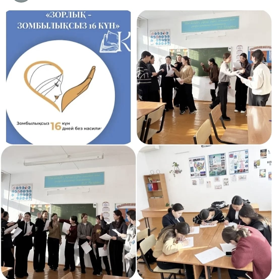 "Гендерлік зорлық-зомбылыққа қарсы іс-қимылдың 16 күн" акциясы жоспарына сәйкес оқушылармен "Зорлық-зомбылықсыз балалық шақ" атты тәрбие сағаттары өтілді.Тәрбие сағаты барысында зорлық-зомбылық туралы мағлұмат беріліп, адамның жаны мен тәніне үлкен зардап әкелетін соққы екенін және зорлыққа қарсы біздің елімізде заң бар екенін айтылды. Оқушыларға өз жүрген орталарында мейірімді болуға, бұзақылық істерге бармауға, адами бойларындағы қасиеттерін сақтауға,әдепті де, тәртіпті тұлға болып қалыптасуларына ақыл-кеңестер айтылды.