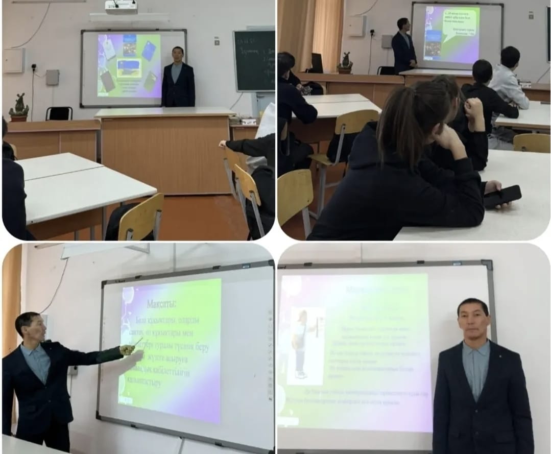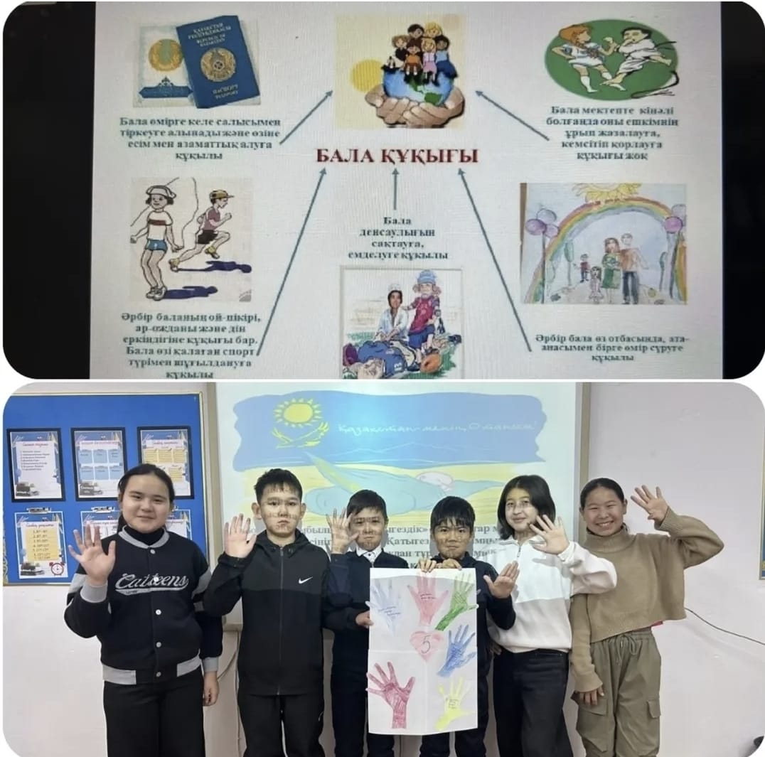 Мектебіміздің тарих және география пәнінің мұғалімі - Б.Р.Магметов "Гендерлік зорлық-зомбылыққа қарсы іс-қимылдың 16 күн" акциясы жоспарына сәйкес оқушылармен "Бала құқықтарын қорғау" атты танымдық сабақ өткізді. Сабақ барысында адам құқығы, оның ішінде бала құқығы, әрбір адам өз құқығын біліп, өзгенің құқығын бұзбауға, құқықтық тәрбие жайлы айтылды.Оқушыларға заң білімі саласынан мағлұмат бере отырып, өз құқықтарын жете білуге, өз беттерімен салыстыра білуге, өмірде қолдана білуге бағыт-бағдар берілді.